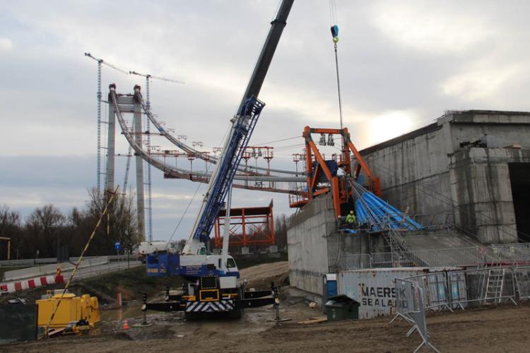 * potrivit unor informații obținute de Mediafax.ro din partea Companiei Naționale de Administrare a Infrastructurii Rutiere (CNAIR), lucrările la podul suspendat peste Dunăre sunt gata în proporție de două treimi * săptămâna trecută, potrivit informațiilor prezentate, au fost făcute lucrări la cablul principal, dar și la structura viitoarelor drumuri de legătură