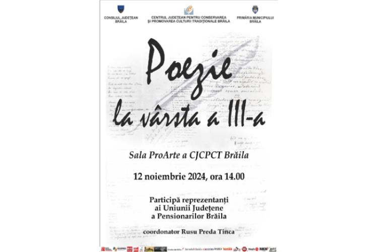 Consiliul Județean Brăila, prin Centrul Județean pentru Conservarea și Promovarea Culturii Tradiționale, și Primăria Municipiului Brăila organizează marți, 12 noiembrie, începând cu ora 14:00, activitatea culturală „Poezie la vârsta a treia”, desfășurată sub egida „La o cafea despre Brăila” – un eveniment devenit tradiție, „un punct de reper în agenda manifestărilor culturale ale Brăilei, o oportunitate minunată pentru seniori și nu numai, de a se bucura de lumea cărților, de a-și împărtăși pasiunea pentru lectură și de a explora noi idei și perspective literare”.