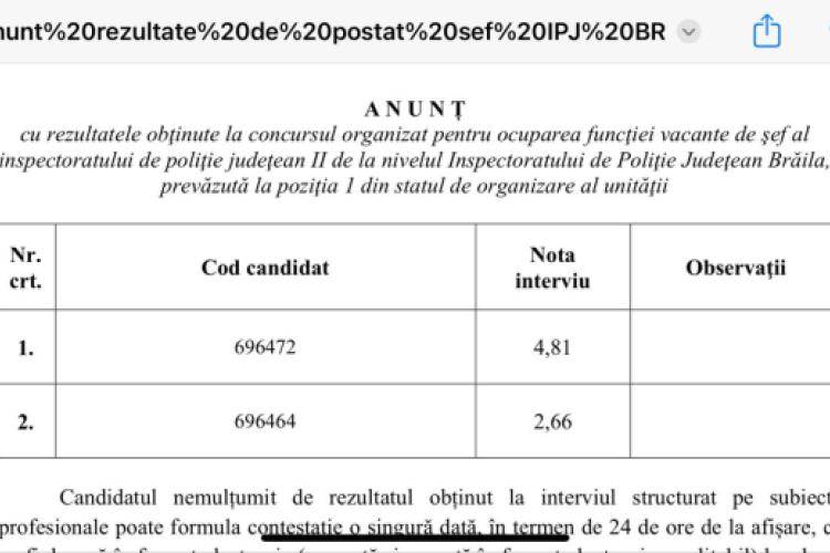 Vești proaste! Nu a fost numit vreun șef al Inspectoratului de Poliție Județean (IPJ) Brăila, asta deoarece cei doi candidați care s-au înscris pentru concursul din data de 12 decembrie nu au obținut note de trecere. Rezultatele au fost postate seara, după ora 21.00, pe site-ul Poliției Române, iar notele obținute de candidați au fost cu mult sub minim de 7, nota ce ar fi trebuit obținută pentru a ocupa postul de șef al IPJ Brăila: 4,81 pentru Liviu Bontescu și 2,66 pentru Iorgu Munteanu. Candidații sunt trecuți pe site cu un cod numeric, dar redactorii au aflat din anumite surse care a fost nota pentru fiecare candidat.