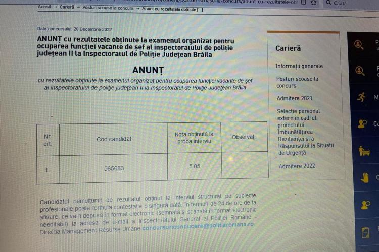 Candidatul pentru şefia Poliţiei Brăila nu a obţinut nota necesară pentru ocuparea funcţiei de conducere. Postul de șef al Inspectoratului de Poliție Județean (IPJ) Brăila a fost scos la concurs, iar proba pentru ocuparea funcției vacante a fost susținută marți, 20 decembrie. Din datele pe care le deținem, cel înscris pentru ocuparea postului de conducere este actualul șef provizoriu al IPJ Brăila, Marius Budu, împuternicit pe funcție. După cum se arată pe site-ul Poliției Române, acesta a obținut nota 5.05, minimul care trebuia obținut pentru promovare fiind 7, ceea ce înseamnă că Poliția Brăila rămâne tot fără inspector șef. Pe site Poliţia Română nu apare nume al candidatului, ci doar un cod.