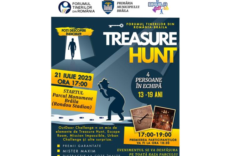 Vineri, 21 iulie, Forumul Tinerilor din România – Brăila și Centrul de Tineret – Brăila Youth Hub, cu sprijinul Primăriei Municipiului Brăila, au pregătit un eveniment plin de adrenalină pentru adolescenții și tinerii cu vârste între 13 și 20 ani. Este vorba despre o nouă ediție ”Treasure Hunt”, un OutDoor Challenge ce cuprinde un mix de elemente de Escape Room, Mission Impossible, Urban Challenge și multe altele. Activitatea se desfășoară pe toată raza Parcului Monument Brăila, între orele 17.00-19.00, iar participanții vor fi grupați în echipe de patru persoane. La final, cei care rezolvă misiunea vor fi răsplătiți cu premii.