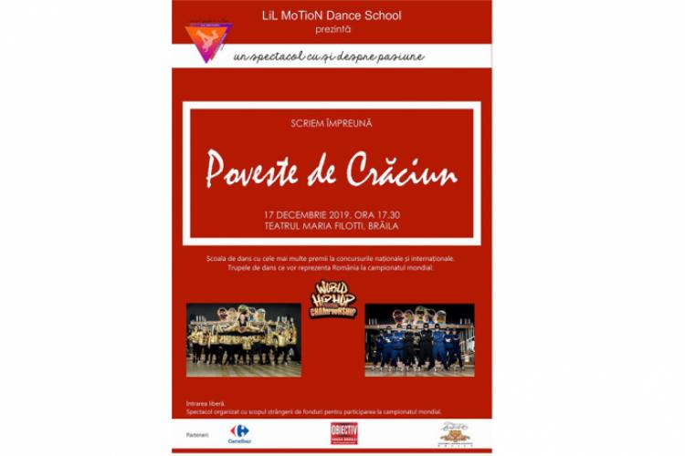 Elevii şcolii de dans, împreună cu coregrafa Liliana Stan, vă invită marţi, 17 decembrie, începând cu ora 17.30, la Teatrul “Maria Filloti”, la spectacolul caritabil “Poveste de Crăciun”. Cele mai bune trupe de dans din Brăila vă invită să petreceţi o seară de poveste, în care veţi fi vrăjiţi de magia dansului. Intrarea este liberă, în limita locurilor disponibile, participanţii fiind invitaţi să facă o donaţie minimă recomandată de 20 lei, o sumă mică dar prin care şi îi sprijiniţi astfel pe talentaţii dansatori să reprezinte din nou cu mândrie Brăila şi România la Campionatul Internaţional de Hip Hop din Statele Unite. La rândul lor, cei din echipa Lil Motion vor aduce o bucurie copiilor mai puţin norocoşi din Brăila. Este vorba despre micuţi din cartierul Chercea, care vor primi pachete de Crăciun.
