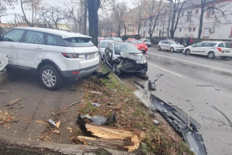 „Prăpăd” în trafic provocat de o șoferiță de 68 de ani. A băgat un om în spital, a avariat patru mașini, a doborât un copac și s-a oprit într-un gard