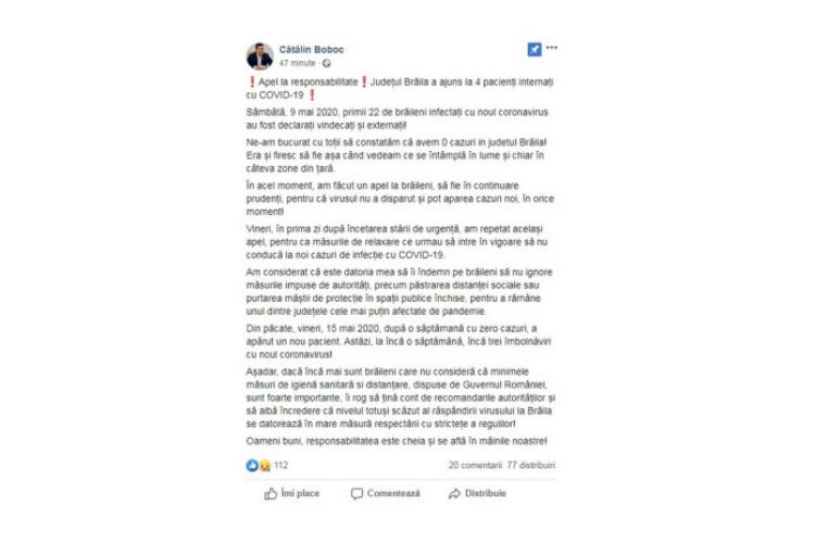 ”Sâmbătă, 9 mai 2020, primii 22 de brăileni infectați cu noul coronavirus au fost declarați vindecați și externați! Ne-am bucurat cu toții să constatăm că avem 0 cazuri în județul Brăila! Era și firesc să fie așa când vedeam ce se întâmplă în lume și chiar în câteva zone din țară. În acel moment, am făcut un apel la brăileni, să fie în continuare prudenți, pentru că virusul nu a disparut și pot aparea cazuri noi, în orice moment! Vineri, în prima zi după încetarea stării de urgență, am repetat același apel, pentru ca măsurile de relaxare ce urmau să intre în vigoare să nu conducă la noi cazuri de infecție cu COVID-19. Am considerat că este datoria mea să îi îndemn pe brăileni să nu ignore măsurile impuse de autorități, precum păstrarea distanței sociale sau purtarea măștii de protecție în spații publice închise, pentru a rămâne unul dintre județele cele mai puțin afectate de pandemie. Din păcate, vineri, 15 mai 2020, după o săptămană cu zero cazuri, a apărut un nou pacient. Astăzi, la încă o săptămână, încă trei îmbolnăviri cu noul coronavirus! Așadar, dacă încă mai sunt brăileni care nu consideră că minimele măsuri de igienă sanitară si distanțare, dispuse de Guvernul României, sunt foarte importante, îi rog să țină cont de recomandarile autorităților și să aibă încredere că nivelul totuși scăzut al răspândirii virusului la Brăila se datorează în mare măsură respectării cu strictețe a regulilor! Oameni buni, responsabilitatea este cheia și se află în mâinile noastre!”, a declarat Boboc.