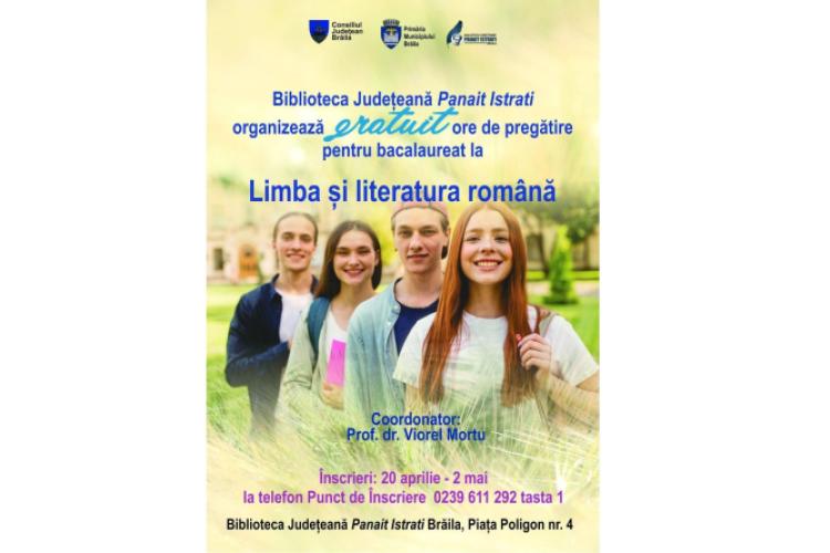 Oportunitate pentru liceenii care vor susține la vară examenul de Bacalaureat! Biblioteca Județeană ”Panait Istrati” anunță că a dat startul înscrierilor la ”Cursul de limba și literatura română”. Orele sunt gratuite și sunt oferite de prof. dr. Viorel Mortu, profesor cu o vastă experiență, mentor pentru generații întregi de elevi.