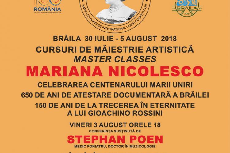 În perioada 30 iulie-5 august, la Brăila se va desfășura Concursul Internațional de canto HARICLEA DARCLEE, iar soprana Mariana Nicolesco va îndruma cursurile de măiestrie artistică “Master Classes”. Manifestările din acest an se vor derula sub genericul celebrării centenarului Marii Uniri, a 650 de ani de atestare documentară a orașului de la Dunăre și împlinirii a 150 de ani de la trecerea în eternitate a lui Gioachino Rossini. Astfel, pe data de 3 august, de la orele 18.00, la Teatrul “Maria Filotti” va avea loc o conferință susținută de Stephan Poen, sâmbătă, pe 4 august, de la orele 21.00, pe scena de pe esplanada Dunării se va desfășura un concert extraordinar, iar concursul se va încheia duminică, pe 5 august, cu un Concert Master Class, care va începe de la ora 17.00, la Sala Mare a Teatrului “Maria Filotti”.