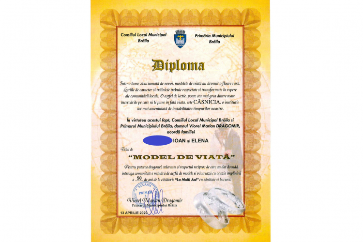 ”Chiar și în momente dificile trebuie să găsim variante pentru a sărbători dragostea și respecta modelele de viață care într-o lume zbuciumată de nevoi, au devenit o floare rară. Lecțiile de caracter și trăinicie trebuie respectate și transformate în repere ale comunității locale. O astfel de lecție, poate cea mai grea dintre toate încercările pe care ni le pune în față viața, este căsnicia. Pentru puterea dragostei, toleranța și respectul reciproc de care au dat dovadă, Primăria Municipiului Brăila oferă periodic Titlul «Model de viață» cuplurilor care împlinesc 50 de ani de căsnicie. La mulți ani!”, a scris primarul Marian Dragomir pe pagina sa de Facebook.