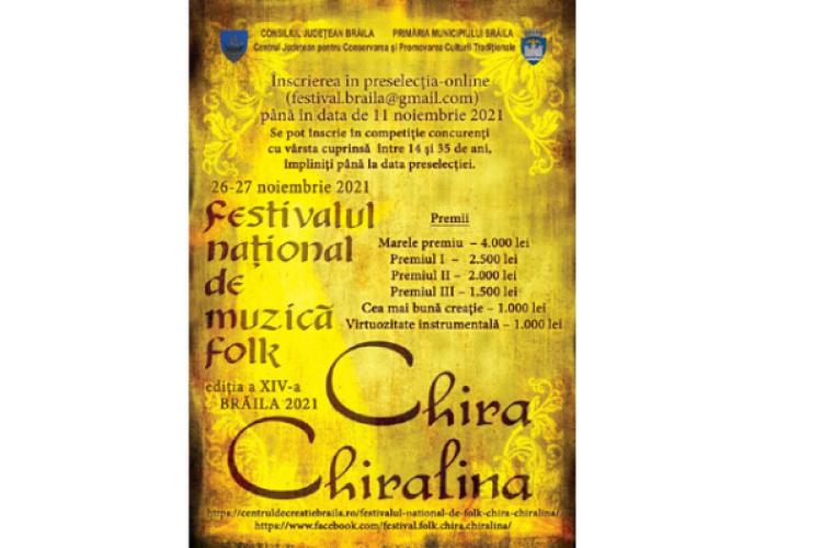S-a dat startul înscrierilor pentru Festivalul Național de Muzică Folk ”Chira Chiralina” – organizat de Centrul Județean pentru Conservarea și Promovarea Culturii Tradiționale Brăila (Centrul de Creație), cu sprijinul Primăriei Municipiului și al Consiliului Județean Brăila – eveniment cultural de excepție ajuns, anul acesta, la cea de a XIV-a ediție.