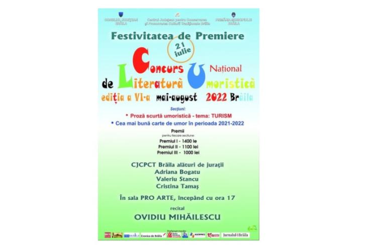 Sala ProArte a Centrului Judeţean pentru Conservarea şi Promovarea Culturii Tradiţionale Brăila (Centrul de Creaţie) găzduieşte joi, 21 iulie 2022, ora 18.00, festivitatea de premiere a Concursului Naţional de Literatură Umoristică – ediţia a VI-a. Manifestarea culturală a fost organizată de Consiliul Judeţean Brăila prin Centrul Judeţean pentru Conservarea şi Promovarea Culturii Tradiţionale şi Primăria Municipiului Brăila.