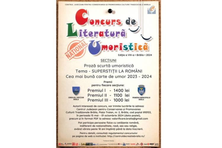Consiliul Judeţean Brăila, prin Centrul Judeţean pentru Conservarea şi Promovarea Culturii Tradiţionale (Centrul de Creație), în parteneriat cu Primăria Municipiului Brăila, organizează cea de-a VIII-a ediţie a Concursului naţional de literatură umoristică.