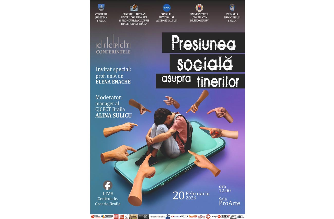 Centrul Județean pentru Conservarea și Promovarea Culturii Tradiționale, în parteneriat cu Consiliul Național al Audiovizualului și Universitatea „Constantin Brâncoveanu”, organizează vineri, 20 februarie, începând cu ora 12:00, Conferința tematică „Presiunea socială asupra tinerilor”, un eveniment dedicat dezbaterii provocărilor cu care se confruntă noile generații în contextul actual. Evenimentul este organizat cu sprijinul Consiliului Județean și al Primăriei Municipiului Brăila.