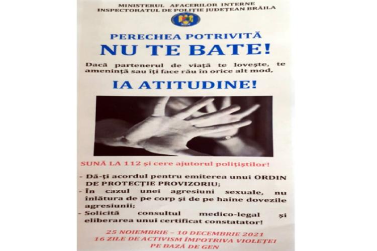 În întreaga lume, începând cu data de 25 noiembrie, s-a dat startul Campaniei “16 zile de activism împotriva violenței pe bază de gen”, care se finalizează la data de 10 decembrie – Ziua Internațională a Drepturilor Omului, și în cadrul căreia instituții publice, organizații non-guvernamentale, asocialții și comunități pun în practică proiecte, activități, campanii ce au ca scop principal eliminarea tuturor formelor de violență împotriva femeilor. “Pentru a se alătura acestor demersuri, reprezentanții Inspectoratului de Poliție Județean Brăila derulează activități de informare preventivă adresate femeilor, atât în mediul urban, cât și în mediul rural, cu scopul de a le conștientiza referitor la importanța identificării timpurii a semnelor unei relații abuzive, a cunoașterii drepturilor pe care o victimă a violenței domestice le are și a instituțiilor la care poate apela pentru ajutor și, cel mai important, la importanța sesizării autorităților competente cu privire la situațiile de abuz. Pentru activitățile din data de 25 noiembrie, polițiștii de prevenire și cei de proximitate au ales o abordare inedită, care a stârnit interes și a adus aprecieri din partea beneficiarelor. Astfel, pornind de la ideea care a stat la baza alegerii sloganului «Perechea potrivită nu te bate!», și anume că alegerile nepotrivite pot aduce suferință, aceștia au ales să se adreseze clientelor și personalului magazinelor care comercializează încălțăminte, de pe raza municipiului Brăila.