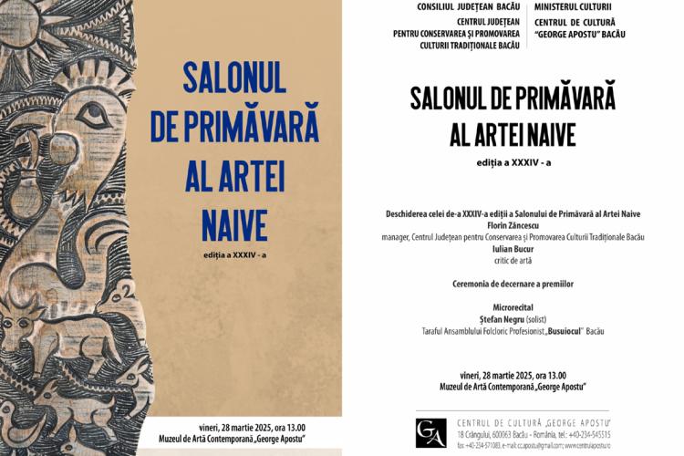 Vineri, 28 martie, începând cu ora 13:00, la Muzeul de Artă Contemporană „George Apostu” din Bacău are loc vernisajul celei de a XXXIV-a Ediții a „Salonului de Primăvară al Artei Naive”. Evenimentul va avea loc la Centrul de Cultură „George Apostu”, din municipiul Bacău. Participă 44 de artiști din județele: Alba, Argeș, Bacău, Brăila, Caraș-Severin, Galați, Iași, Ilfov, Mureș, Prahova, Suceava, Tulcea și Vrancea, care vor expune pe simeze peste 120 de lucrări de artă naivă.