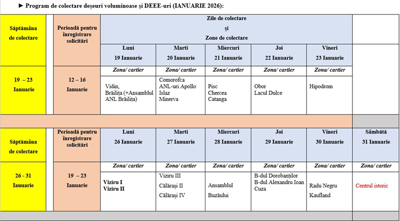 • în municipiul Brăila, campania trimestrială se va desfășura în perioada 19 – 31 ianuarie • cei care vor să scape de mobila veche sau alte tipuri de deșeuri voluminoase trebuie să facă o cerere la numărul de telefon 0725551330, de luni până vineri, între orele 08:00 – 16:00 • înscrierile încep de luni, 12 ianuarie