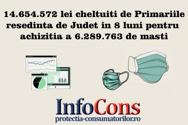 Potrivit InfoCons, primăriile reşedinţă de judeţ care au cheltuit cele mai mari sume pentru achiziţia de măşti în primele opt luni de pandemie sunt: Primăria Municipiului Slatina (5.776.120 lei), Primăria Municipiului Braşov (1.384.529, 30 lei) şi Primăria Municipiului Alba Iulia (838.450,20 lei). De cealaltă parte, primăriile care au cheltuit cele mai mici sume pentru achiziţia măştilor în această perioadă sunt: Primăria Municipiului Ploieşti (12.199,32 lei), Primăria Municipiului Brăila (14.844,06 lei) şi Primăria Municipiului Slobozia (18.061,82 lei).