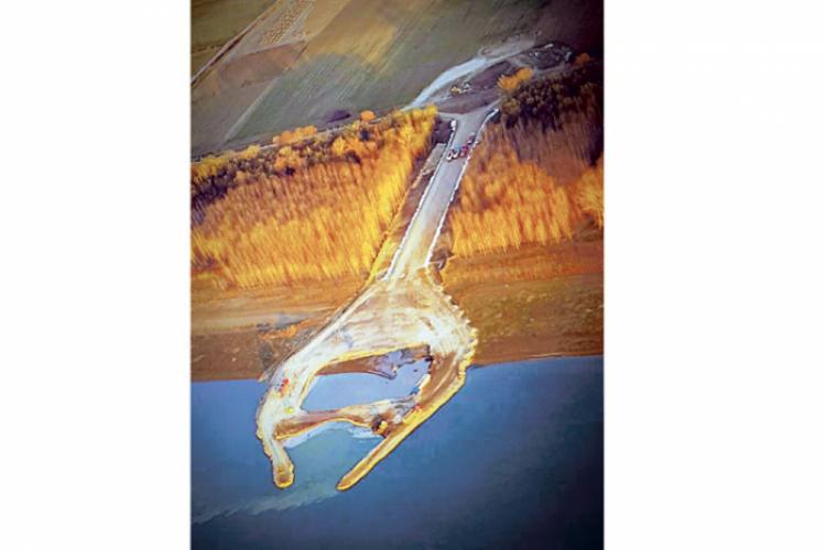 • o fotografie făcută, ieri, din avion, arată că deja se fac pregătiri pentru ridicarea primului pilon al podului • asta se întâmplă pe malul tulcean al fluviului, însă există activitate şi pe malul brăilean, unde se fac pregătiri pentru traversarea peste dig a drumului tehnologic al şantierului • dinspre Bucureşti vin, însă, şi veşti îngrijorătoare • astfel, constructorii ar condiţiona continuarea lucrărilor de rezolvarea unei liste cu 16 revendicări formulate către CNAIR • oficialii CNAIR confirmă existenţa acestor revendicări, însă spun că lucrurile se vor tranşa prin procedură de arbitraj şi că nu există niciun motiv pentru blocarea activităţii de pe şantier