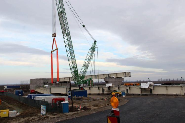 * este vorba despre piesele din componența viaductului de acces dinspre partea brăileană a podului * operațiunea de montare a început joi, piesele de circa 200 tone fiind puse pe poziție de o macara cu capacitatea de 600 tone, manevrele de ridicare și poziționare necesitând o precizie ”la milimetru” * tablierele metalice ale podului propriu-zis, fabricate la Șantierul Naval Brăila, vor fi montate începând cu luna februarie, funcție și de condițiile atmosferice