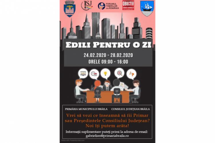 “Edili pentru o zi” este programul prin care adolescenţii şi tinerii din Brăila au şansa de a juca rolul de primar, preşedinte de Consiliu Judeţean, respectiv consilieri locali şi judeţeni. În perioada 24-28 februarie, în fiecare zi, tinerii cu vârste cuprinse între 14 şi 20 de ani vor avea oportunitatea de a înţelege importanţa, rolul şi funcţiile instituţiilor locale şi judeţene, familiarizarea cu procesul decizional şi oferirea unei viziuni practice asupra a ceea ce reprezintă în mod real activitatea Primarului, a Preşedintelui Consiliului Judeţean, şi desigur, a consilierilor locali/judeţeni şi angajaţilor din aceste instituţii.