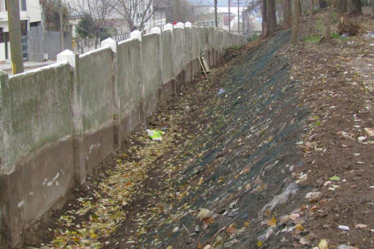 Consemnam recent despre ritmul bun de lucru şi avansul câştigat la reabilitarea totală a gardului din cărămidă şi beton, precum şi la montarea grilajului din fier forjat. Continuă acum, pe ultimii metri repararea gardului din beton de pe Vadul Schelei şi, lucru bun, după reprofilarea taluzului interior, acesta este (parţial!) acoperit cu plasă, iar pentru consolidare e nevoie neapărat şi de o înnierbare de calitate dar şi de reprofilarea întregului taluz şi eliminarea oricărei stavile: rădăcinile unui copac netăiat, pământ, contrapanta dată de configuraţia terenului etc. Altfel se va ajunge la colmatarea şanţului şi, implicit, afectarea din nou a structurii şi rezistenţei gardului scos deja la lumină.