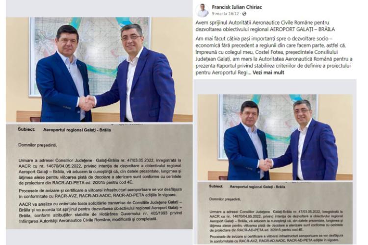 ”Am mai făcut câțiva pași importanți spre o dezvoltare socio – economică fără precedent a regiunii din care facem parte, astfel că, împreună cu colegul meu, Costel Fotea, președintele Consiliului Județean Galați, am mers la Autoritatea Aeronautică Română pentru a prezenta Raportul privind stabilirea criteriilor de definire a proiectului pentru Aeroportul Regional Galați – Brăila. AACR ne-a dat răspunsul, astfel că va acorda tot sprijinul pentru construirea aeroportului. Totodată, din raportul prezentat, autoritatea a precizat că lungimea și lățimea alese pentru viitoarea pistă de decolare/aterizare, sunt conforme cu cerințele de proiectare impuse de lege”, a declarat Chiriac, într-un mesaj postat pe rețelele de socializare.