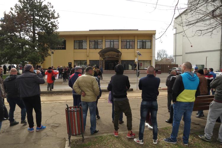 Moment în care organizatorii conferinţei au mărit volumul în boxe, ca să nu se audă nici cei care strigau afară, nici brăileanul pătruns în clădire.