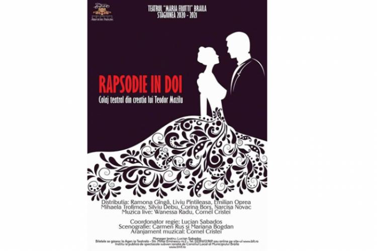 Duminică, 4 octombrie, de la ora 18,00, în Sala Mare a Teatrului „Maria Filotti” se va juca „RAPSODIE ÎN DOI”, un spectacol coupe din dramaturgia lui Teodor Mazilu, creaţie colectivă a trupei de actori brăileni, sub coordonarea şi regia managerului Lucian Sabados.