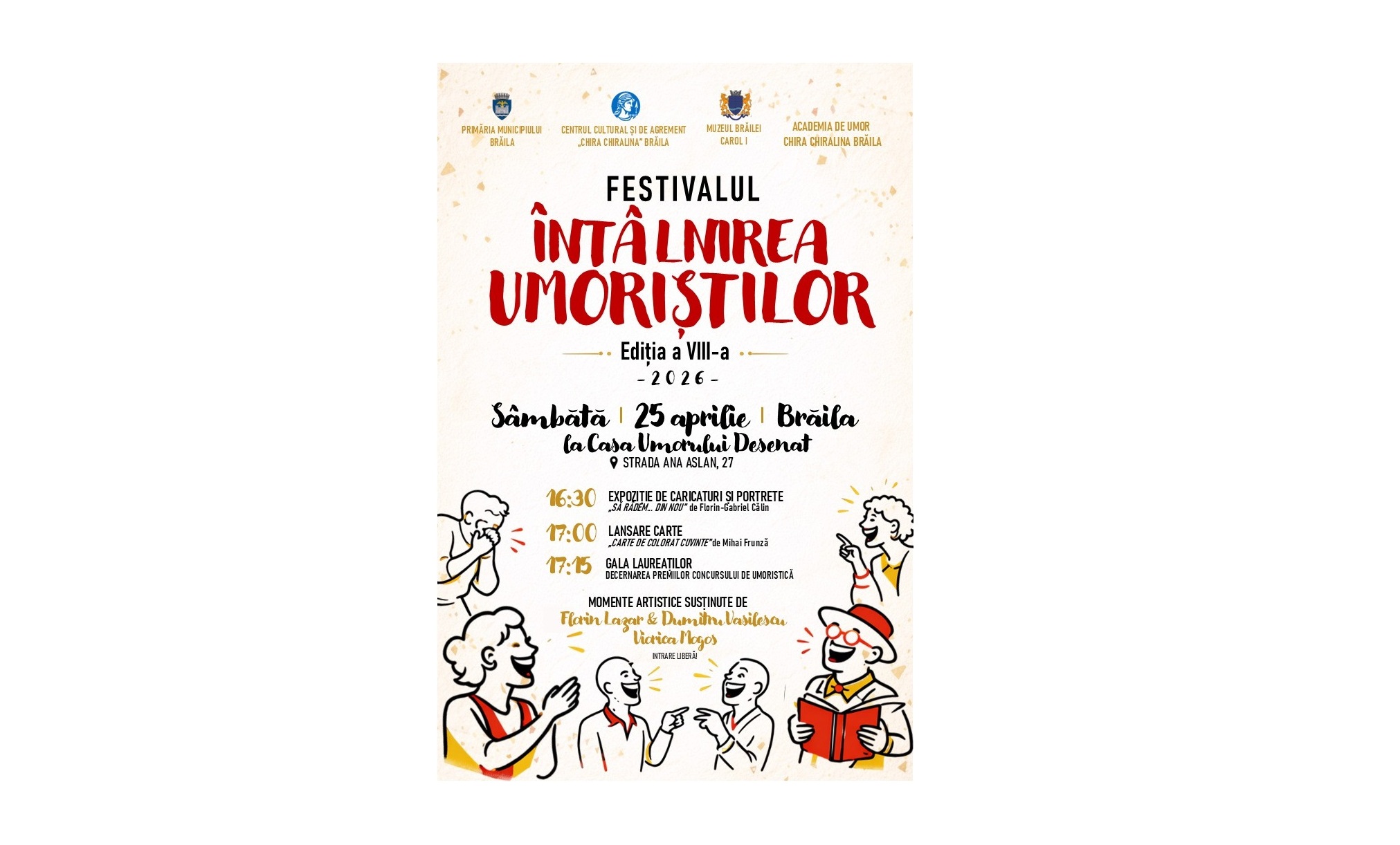 Centrul Cultural și de Agrement „Chira Chiralina” Brăila, în colaborare cu Academia de Umor „Chira Chiralina”, organizează sâmbătă, 25 aprilie, de la ora 16:30, Gala Laureaților celei de-a VIII-a ediții a Festivalului-Concurs „Întâlnirea Umoriștilor”.