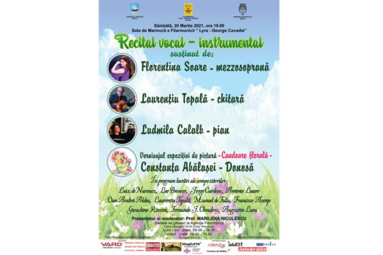 Sâmbătă, 20 martie, de la ora 19.00, la Casa Tineretului Brăila – Sala de Marmură, va avea loc un recital vocal-instrumental de excepție susținut de Filarmonica ” Lyra – George Cavadia”, filarmonică ce se află sub autoritatea Consiliului Județean. Totodată, melomanii prezenți la eveniment se pot bucura de o expoziție de pictură “Candoare florală”, lucrări expuse de artistul plastic Constanța Abălașei – Donosă.