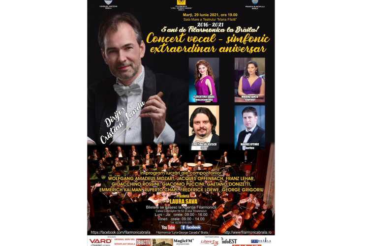 Un regal de opera şi operetă, dedicat împlinirii a 5 ani de la înfiinţarea Filarmonicii “Lyra – George Cavadia” Brăila şi sărbătoririi Zilei Internaţionale a Dunării. Concertul vocal-simfonic aniversar extraordinar, la care Filarmonica “Lyra – George Cavadia”, filarmonica ce se afla sub autoritatea Consiliului Judeţean Brăila, vă invită să luaţi parte, se înscrie pe linia concertelor unde talentul, profesionalismul şi vocaţia muzicienilor produce frumuseţe, bucurie, fericire, linişte, lumină şi multă ordine, în minţile, sufletele şi vieţile oamenilor, mai necesare ca oricând.