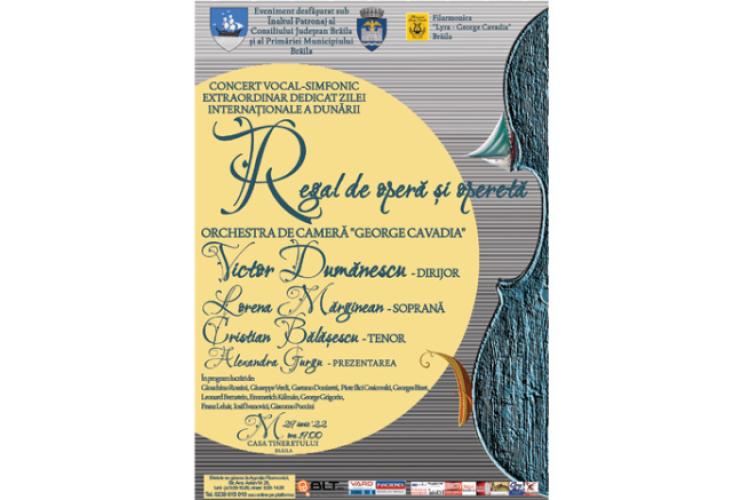 O altă stagiune își scrie acordurile cadenței finale în care sunt imortalizate simțirile concertelor ce au fost, dar și gândurile despre concertele nenăscute încă ale stagiunii viitoare. Filarmonica „Lyra – George Cavadia” Brăila marchează acest moment printr-un Concert vocal-simfonic extraordinar, denumit, cu toată puterea cuvântului, „Regal de operă și operetă”, o experiență aparte, pe care o veți trăi prin și alături de invitații Maestrul Victor Dumănescu, din a cărui baghetă dirijorală izvorăsc de fiecare dată viziuni interpretative memorabile, soprana Lorena Mărginean, tânăr muzician care deja a cucerit publicul atât prin delicatețea sa, cât și prin calitățile vocale incontestabile, și nu în ultimul rând tenorul Cristian Bălășescu, fiu al Brăilei, ce a profitat de zestrea sa muzicală și pe care a îmbogățit-o prin muncă, fiind în prezent Prim Solist al Operei Naționale Române Timișoara. Concertul are dublă însemnătate, el fiind dedicat Zilei Internaționale a Dunării și vă va purta într-o croazieră muzicală de-a lungul undelor sonore.