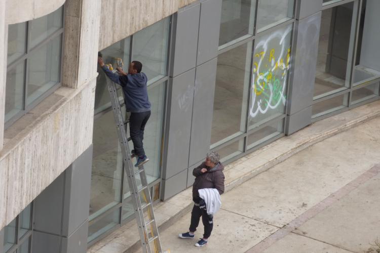 * asociaţia de proprietari din blocul unde se află imensul spaţiu comericial nu a mai suportat situaţia şi s-a apucat să şteargă “operele de artă” de pe vitrine * munca a fost asigurată de asociaţie, însă proprietarul magazinului a fost de acord să suporte costurile operaţiunii * urmează să fie şterse şi zidurile * vestea bună este că şi locul de joacă pentru copii, din apropiere, a fost reabilitat de Primărie * vestea proastă e că nu se iau măsuri pentru sancţionarea indivizilor puşi pe scandal şi stricăciuni care se adună seară de seară acolo