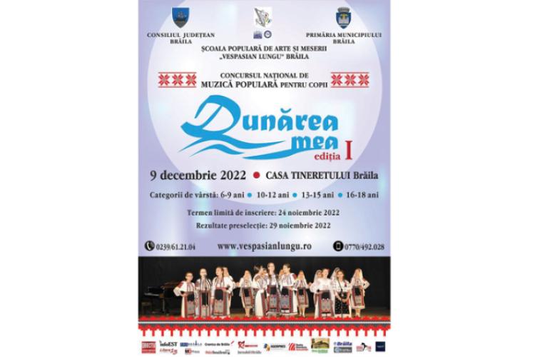 Start pentru înscrieri la prima ediție a Concursului Național de Muzică Populară pentru Copii „Dunărea mea”, organizat de Școala Populară de Arte și Meserii „Vespasian Lungu” Brăila, pe data de 9 decembrie a.c., la Casa Tineretului.