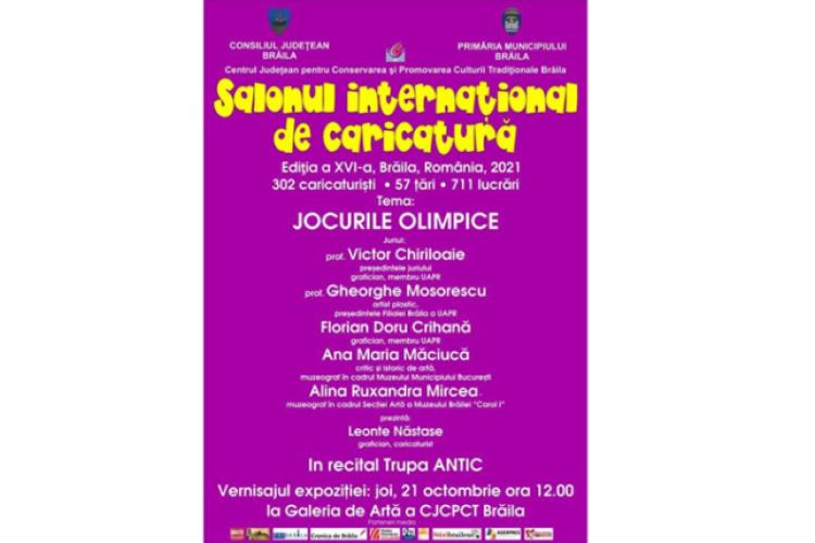Galeria de Artă a Centrului de Creație Brăila, din Piața Traian nr. 2, găzduiește joi, 21 octombrie, de la ora 12.00, vernisajul celei de-a XVI-a Ediții a Salonului Internațional de Caricatură de la Brăila – eveniment organizat de Consiliul Județean, Primăria Municipiului și Centrul Județean pentru Conservarea și Promovarea Culturii Tradiționale (CJCPCT – Centrul de Creație) Brăila, cu participarea a sute de caricaturiști din zeci de țări ale lumii. Prezentat de Leonte Năstase, grafician și caricaturist, și având ca temă ”Jocurile Olimpice”, evenimentul se va bucura de participarea cunoscutei Trupe Antic, care va susține un recital.