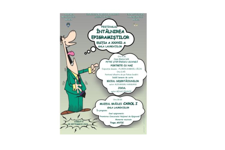 Cei mai buni epigramişti şi oameni de umor din România și din Republica Moldova vor veni, în acest week-end, la Brăila, pentru a participa, astăzi, sâmbătă, 28 septembrie, începând cu ora 18:00, în Sala „Regele Ferdinand I și Regina Maria” a Muzeului Brăilei „Carol I”, la Gala Laureaților celei de-a XXXVII-a ediție a Festivalului Concurs „Întâlnirea epigramiştilor”, manifestare organizată de Casa de Cultură a Municipiului Brăila și Clubul Umoriştilor Brăileni (CUB) „Ştefan Tropcea”, în colaborare cu Primăria Municipiului Brăila.
