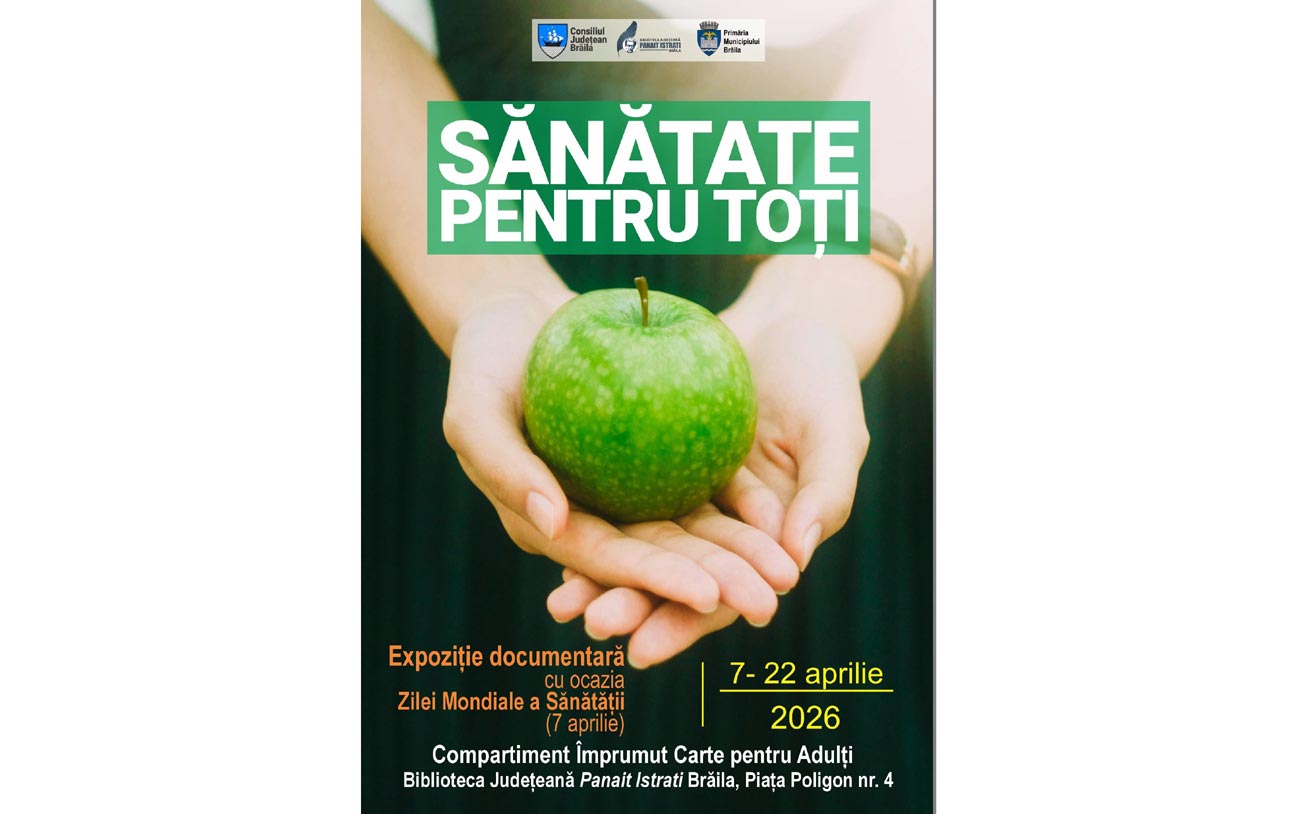 Cu prilejul Zilei Mondiale a Sănătății, marcată, anual, la data de 7 aprilie, Biblioteca Județeană „Panait Istrati” Brăila organizează expoziția documentară intitulată „Sănătate pentru toți”, menită să aducă în atenția publicului importanța prevenției și a informării corecte în domeniul sănătății.