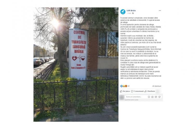 ”În aceste vremuri complicate, orice donație către sistemul de sănătate e binevenită, în special aceea de sânge. În urma apelurilor pentru donarea de sânge, promovate de toate canalele de mass media, Alianța USR-PLUS a inițiat o campanie de promovare a acestei acțiuni umanitare în rândul membrilor și nu numai. Membrii noștri s-au mobilizat, dar, la Brăila… surpriză. Când s-au prezentat la Centrul de transfuzii, mulți din voluntari au fost respinși, de către paznicul centrului, pe motiv că nu au mai donat anterior. Nu am crezut această explicație și am sunat la Centrul de Transfuzie Sanguină Brăila, fiind informați că cei care nu sunt în evidență ca donatori, nu au voie sa doneze, nici măcar cu adeverință de la medicul de familie, până când trece epidemia de Covid-19. Este aberant ca efortul nostru să fie zădărnicit în condițiile în care criza de sânge este generalizată la nivelul întregii țări. Rugăm autoritățile să nu trateze superficial acest aspect și să stabilească reguli clare privind verificarea și admiterea donatorilor. Chiar pe pereții interiori ai centrului de transfuzii scrie mare: SÂNGELE ÎNSEAMNĂ VIAȚĂ. Nu este momentul să dăm cu piciorul unei astfel de resurse”, se arată în mesajul postat pe Facebook.