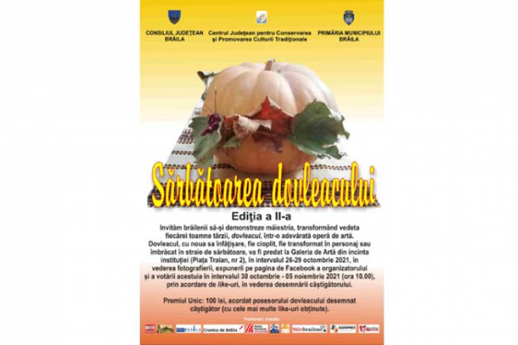 Centrul Județean pentru Conservarea și Promovarea Culturii Tradiționale Brăila (Centrul de Creație), cu sprijinul Consiliului Județean și al Primăriei Municipiului Brăila organizează în această perioadă cea de a II-a Ediție a Sărbătorii dovleacului, la care sunt invitați să participe toți cei care, inspirați de poveștile copilăriei, pot transforma dovleacul într-o operă de artă.