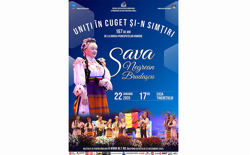 Cunoscuta interpretă de muzică populară ardelenească Sava Negrean Brudașcu va susține un concert pe scena Casei Tineretului, intitulat „Uniți în cuget și-n simțiri”, în preajma sărbătoririi a 167 de ani de la Unirea Principatelor Române. Evenimentul – organizat de Consiliul Județean Brăila, Centrul Județean pentru Conservarea și Promovarea Culturii Tradiționale și Primăria Municipiului Brăila – va avea loc joi, 22 ianuarie 2026, începând cu ora 17:00, la Casa Tineretului (recent reabilitată) de pe Calea Călărașilor. Biletele pot fi achiziționate încă de pe acum de pe site-ul www.blt.ro, iar prețul unui bilet pentru concertul artistei Sava Negrean Brudașcu este de 31, 80 lei.