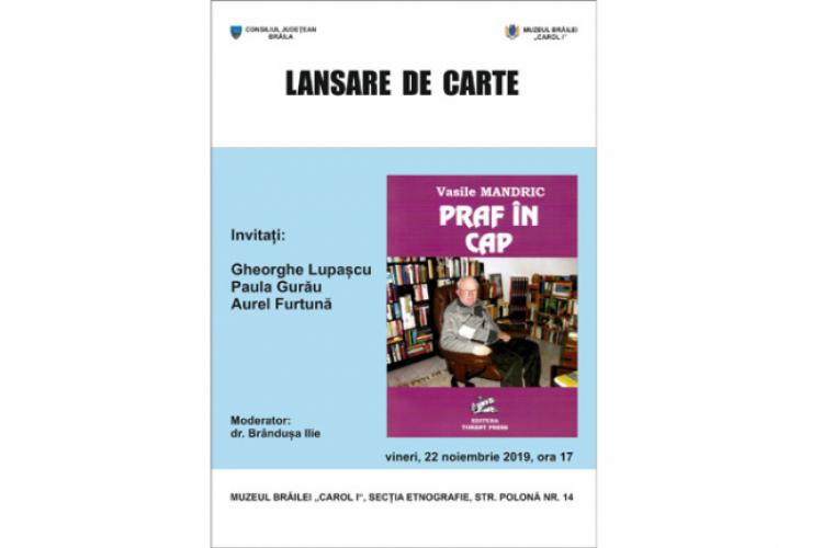 Vineri, 22 noiembrie 2019, ora 17,00, la Secţia “Etnografie” a Muzeului Brăilei “Carol I” din strada Polonă nr.14, va avea loc lansarea cărţii “Praf în cap”, semnată de Vasile Mandric. Evenimentul va fi prezentat de: Gheorghe Lupaşcu, Paula Gurău şi Aurel Furtună şi moderat de muzeograful Brînduşa Ilie.