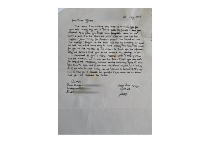 Scrisoare de mulţumire adresată unui poliţist de la transporturi, care i-a recuperat bagajul din tren unei tinere din Turcia