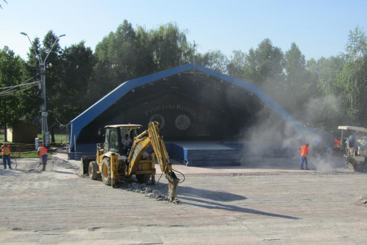 • principalul spațiu pentru spectacole în aer liber din municipiu își schimbă, astfel, complet aspectul, după ce scena și copertina au fost reabilitate în urmă cu doi ani • betonul îmbătrânit va fi înlocuit cu asfalt, pe toată suprafața platoului • muncitorii firmei ”Promotas” trag tare, pentru a termina lucrarea înainte de Zilele Brăilei • norii de praf de pe șantier ridică semne de întrebare referitoare la respectarea normelor de protecția muncii