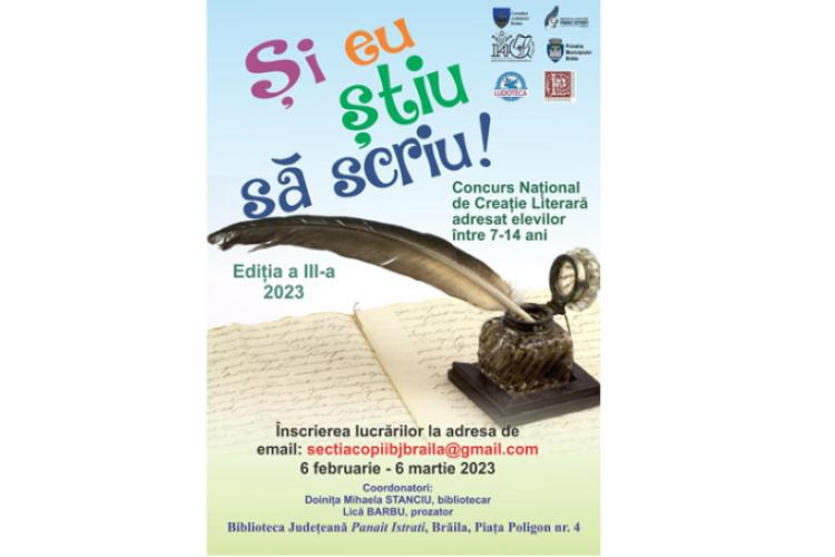 Biblioteca Județeană “Panait Istrati” Brăila și Asociația Culturală Leviathan București, organizează Concursul Național de Creație Literară “Și eu știu să scriu!”, ediția a III-a, 2023. Competiția are ca scop descoperirea și sprijinirea copiilor talentați, cu simț estetic și înclinație spre scris.