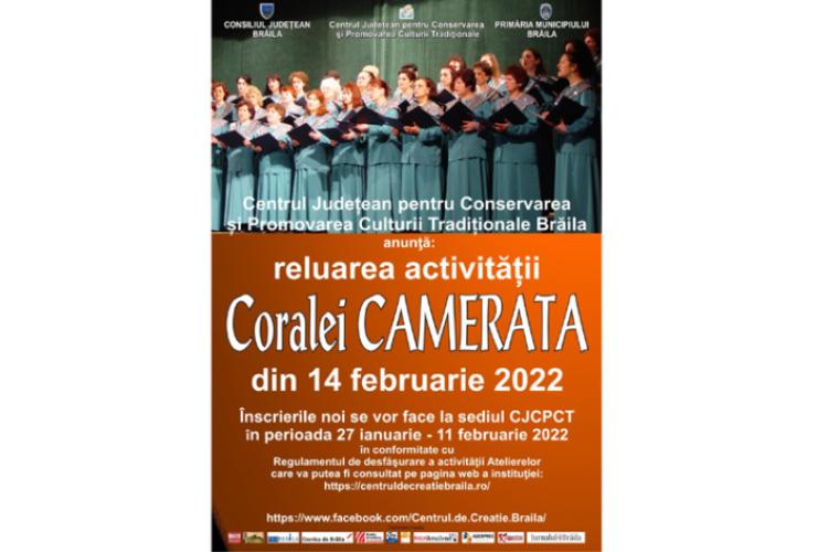 Corala Feminină „Camerata” își va relua activitatea artistică de la jumătatea acestei luni, informează Consiliul Județean Brăila, Primăria Municipiului și Centrul Județean pentru Conservarea și Promovarea Culturii Tradiționale Brăila (Centrul de Creație) Brăila. Totodată, Centrul de Creație Brăila anunță că se mai fac înscrieri pentru includerea în „Camerata” până la data de 11 februarie, iar pe 14 februarie aceasta își va relua, efectiv, activitatea. Înscrierile se fac la sediul Centrului Județean pentru Conservarea și Promovarea Culturii Tradiționale Brăila (CJCPCT) din Piața Traian nr. 2, iar Regulamentul de desfășurare a activității Atelierelor poate fi consultat pe pagina web a instituției (http://centruldecreatiebraila.ro). Informații suplimentare se pot obține la numărul de telefon 0239/614.710.