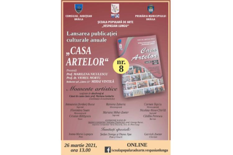 Școala Populară de Arte „Vespasian Lungu” Brăila, cu sprijinul Consiliului Județean Brăila și al Primăriei Municipiului Brăila, organizează astăzi, începând cu ora 13.00, pe pagina sa de Facebook evenimentul de lansare a numărului opt al publicației culturale anuale „Casa artelor”, aferentă anului 2020. Cu această ocazie, vor fi prezente alocuțiuni susținute de: profesor Marilena-Viorica Niculescu, profesor doctor Viorel Mortu, Mihai Vintilă – redactor-șef revista „Litera 13”, Ioana-Maria Lupașcu – pianist – concertist, Ștefan Doniga – pianist și Diana Jipa – violonist.