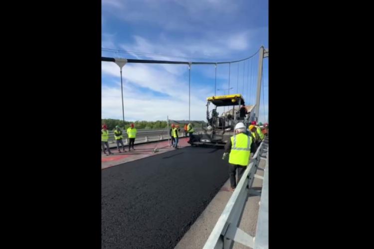 Se toarnă un nou covor asfaltic, pe podul peste Dunăre
