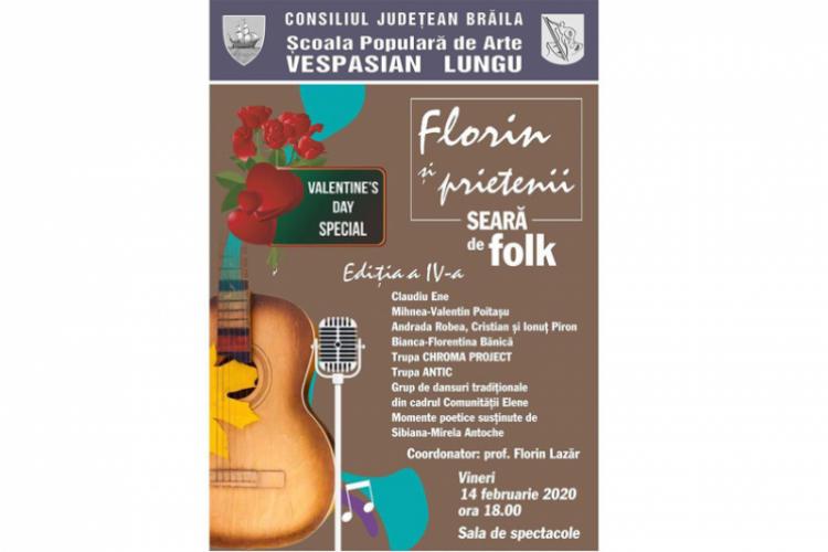 Vineri, 14 februarie 2020, începând cu ora 18.00, în sala de spectacole a Şcolii Populare de Arte “Vespasian Lungu” Brăila, va avea loc cea de-a IV-a ediţie a Serii de folk “Florin şi prietenii”, organizată cu prilejul Valentine’s Day.