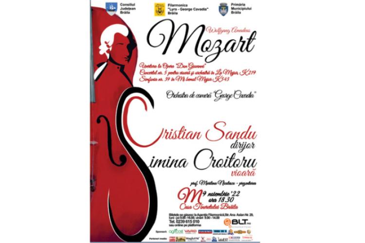 În interpretarea reputatei violoniste și a Orchestrei de cameră „George Cavadia” Brăila, la pupitrul căreia se va afla îndrăgitul dirijor Cristian Sandu, va răsuna Concertul nr. 5 pentru vioară și orchestră în La Major K. 219, putând să ne bucurăm atât de melodicitatea scriiturii compozitorului, cât și de bogăția de expresie a interpretei. Va fi o seară Mozart, o seară cu strălucirile cristaline ale muzicii, completată de Uvertura la Opera „Don Giovanni” și de Simfonia nr. 39 în Mi bemol Major K. 543, a mai precizat sursa citată.