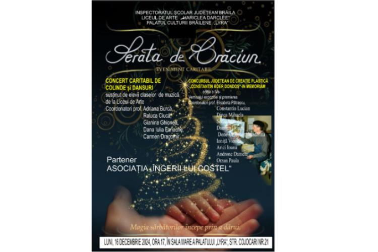 Astăzi, la ora 17.00, în Sala Mare a Palatului ”Lyra”, brăilenii sunt invitați la o ”Serată de Crăciun”, Concert caritabil și Festivitate de Premiere Concurs Arte Plastice ”CBDondoș”.