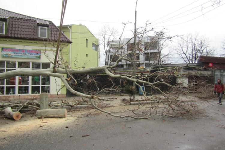 • arborele a fost tăiat, joi, de o echipă a Seroplant, asistată de o macara de mare tonaj • conducerea instituției spune că a trebuit luată această măsură, deoarece în trunchiul copacului se formase o scorbură de mari dimensiuni, astfel că exista riscul prăbușirii în caz de furtună sau viscol