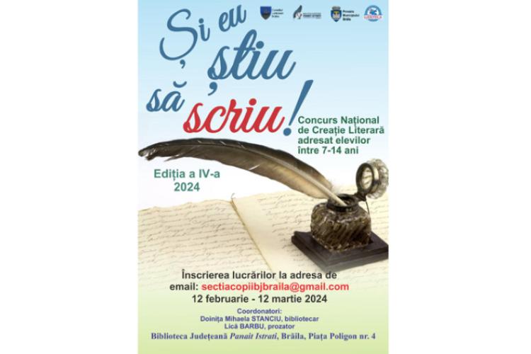 Biblioteca Județeană ”Panait Istrati” Brăila organizează Concursul Național de Creație Literară ”Și eu știu să scriu!”, ediția a IV-a, cu scopul de a descoperi și promova copiii talentați cu aptitudini în domeniul literaturii (poezie și proză scurtă).